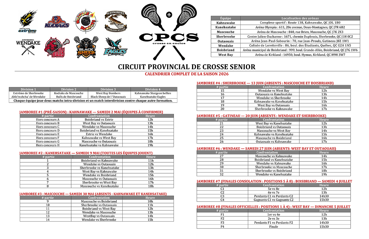 La saison officielle du Circuit Provincial de Crosse Sénior (CPCS) débutera sous peu! 8 équipes composeront la ligue alors que 32 parties officielles composeront la saison 2026.
